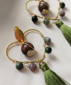 Aretes con base de corazón, tejidos con alambre y piedras naturales. Topos en bronce y Borlas.