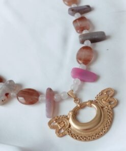 Collar largo de Agatas alargadas, planas y cuarzos rosa – Dije Precolombino Nariguera Serpiente de dos cabezas Tairona