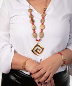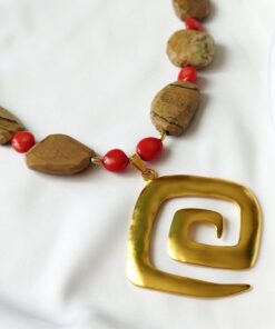 Collar largo Precolombino en Piedras naturales de Jasper Madera y Corales – Dije representativo de la cultura indígena Calima.