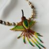 Gargantilla en Piedras naturales de Amatistas, Cuarzo Rosa, Cuarzo cristal y Citrino – con Dije de Colibrí tejido a mano por indígenas del Putumayo.